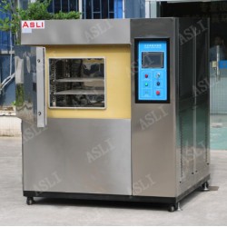 ASLI風門式溫度沖擊測試機可提供產業界大型零件、半成品、成品進行溫濕度環境測試,其主要由控制面板、配電盤、保溫庫板、送風機、加熱器、加濕器、冷凍機組合而成,主要規格區分七種標準室內尺寸及28種不同條件測試規范。采用離心送風方式之水平擴散垂直熱交換循環系統,避免死角使室內溫濕度分布均勻。