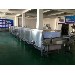 巴氏殺菌機說明: 使用說明:巴氏消毒是利用病原體不是很耐熱的特點,通過適當的溫度和保溫時間,將其全部殺滅。在食品生產中,封口后的罐或 ( 袋 )經輸送帶的傳送,進入隧道式巴氏殺菌機的內部。在巴氏殺菌機中的各個溫度區域內,產品的溫度受到精細的調節。當通過隧道時,容器受到不同溫度水的噴淋,也就是預熱階段、加熱階段(殺菌階段)、和冷卻階段。殺菌機前端的逐步加熱和后端的逐步冷卻是非常重要的。這樣,既可以避免過熱而造成的口味損失,又能夠防止容器熱應力的突變而產生的碎瓶。在隧道式巴氏殺菌機中,安裝了多組噴淋嘴,熱水通過這些噴淋嘴噴淋到容器上,按工藝要求的不同時間和溫度,實現對食品的巴氏殺菌。