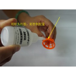 第四步:QIS-3055L膠水適用于針頭打膠,固化后不發白、無痕跡、定位快(3-6秒定位),30分鐘左右具有撕裂材質不脫膠效果!