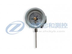 防爆電接點雙金屬溫度計帶有電接觸裝置-即機械電接點。當被測介質溫度變化時,自由端上的細軸及轉向傳動機構帶動指針及動觸點轉動,在標度盤上指示出溫度的變化值,當其與定觸點(上、下限定觸點)接觸或斷開的瞬時,使電路系統中的繼電器及接觸器動作,以達到自動控制和報警的目的。