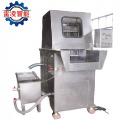 采用齒形步進送料,步距準確,肉料由三組可拆卸的格條支撐,注射針采用氣壓彈簧控制,注射的時候是可停留的,真正能夠達到帶骨注射。注射壓力、注射率、步進距離和速度,可根據注射物料大小以及被注射物的組織結構,可任意調整,能夠達到理想的注射效果。另外,該機為防止針頭堵塞采用兩*過濾,設有風力通針裝置,操作簡單,維修方便,是肉食加工的理想設備